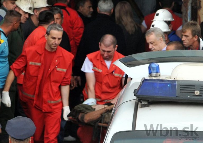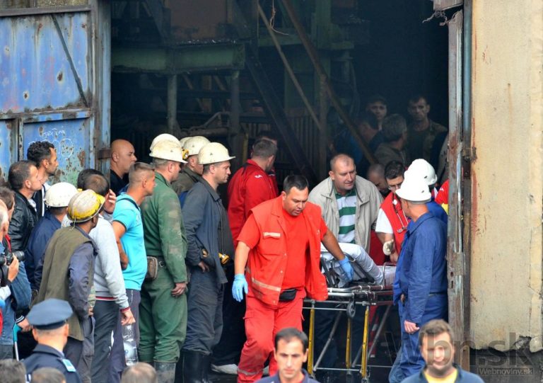Zdravotníci vynášajú z priestorov bane zraneného baníka. Štvrtkový výbuch plynu v bani v bosnianskom mestečku Zenica v dôsledku zemetrasenia neprežilo päť mužov. Sarajevo, Bosna, 5. septembra 2014. Foto: SITA/AP