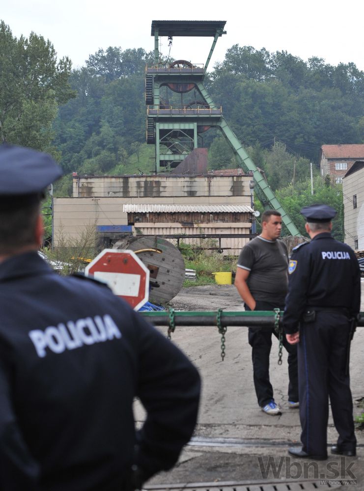 Policajti hliadkujú v okolí zasypanej bane Raspotočje. Štvrtkový výbuch plynu v bani v bosnianskom mestečku Zenica v dôsledku zemetrasenia neprežilo päť mužov. Sarajevo, Bosna, 5. septembra 2014. Foto: SITA/AP