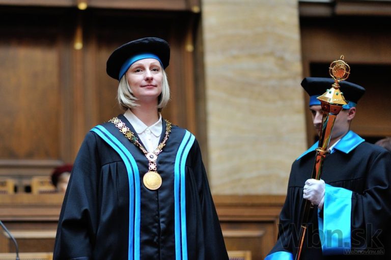 Dekanka Fakulty sociálnych a ekonomických vied UK Lucia Mokrá počas slávnostnej inaugurácie desiatich dekanov fakúlt Univerzity Komenského v Bratislave. Foto: SITA/Robert Tappert