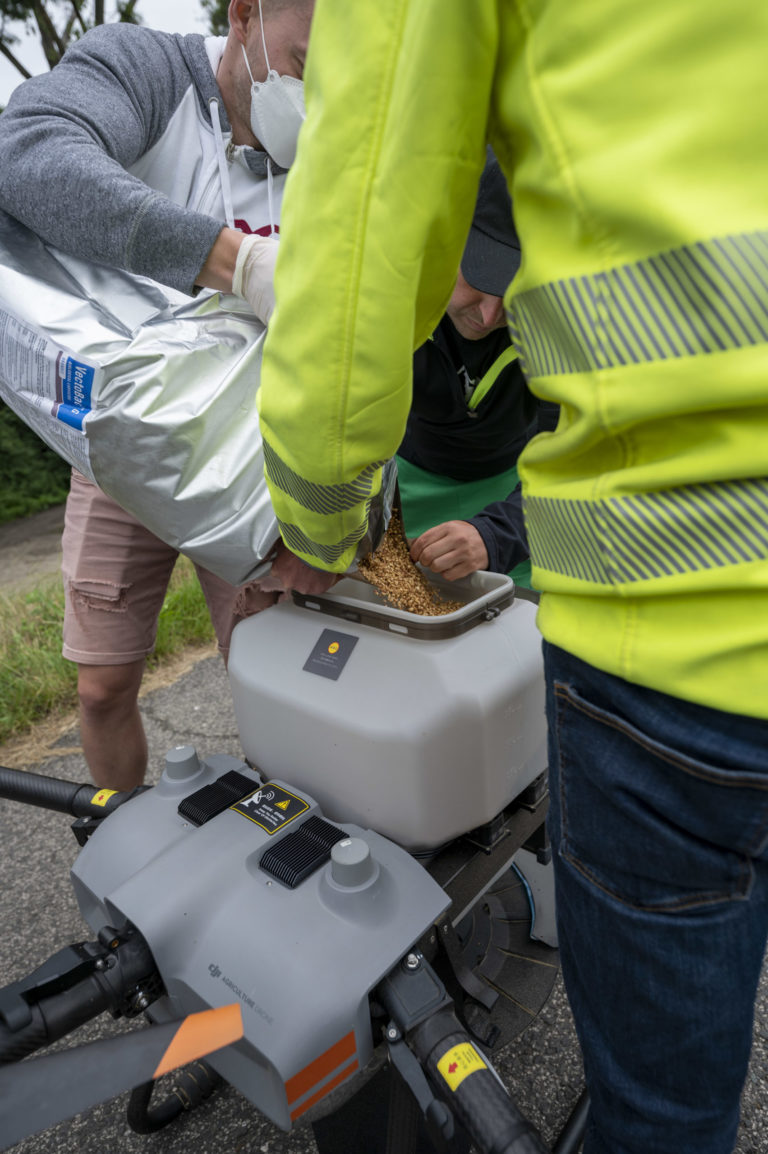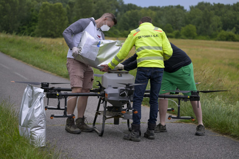 Doplnenie granulovaného larvicídu BTI počas zásahu na elimináciu komárov prostredníctvom dronu v blízkosti Ovsištskej lúky v Petržalke. Bratislava, 12. jún 2024. Foto: SITA/Milan Illík.