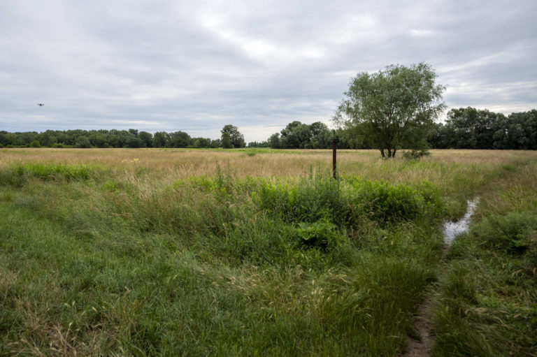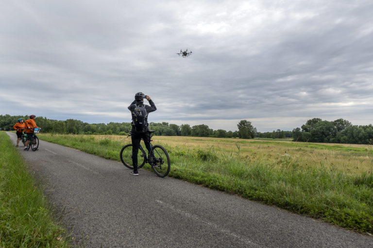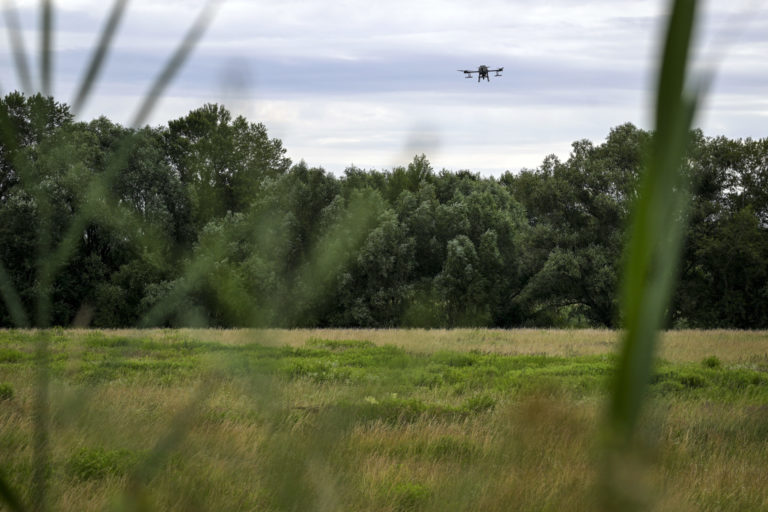 Zásah na elimináciu komárov aplikáciou larvidcídu BTI prostredníctvom dronu v blízkosti Ovsištskej lúky v Petržalke. Bratislava, 12. jún 2024. Foto: SITA/Milan Illík.