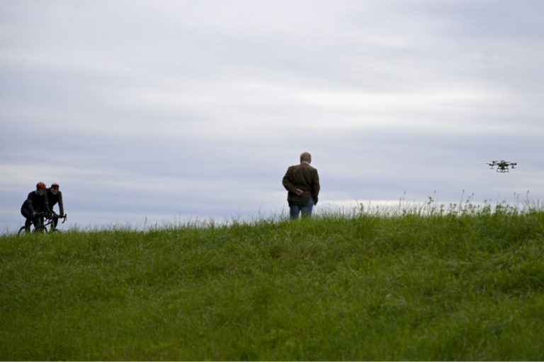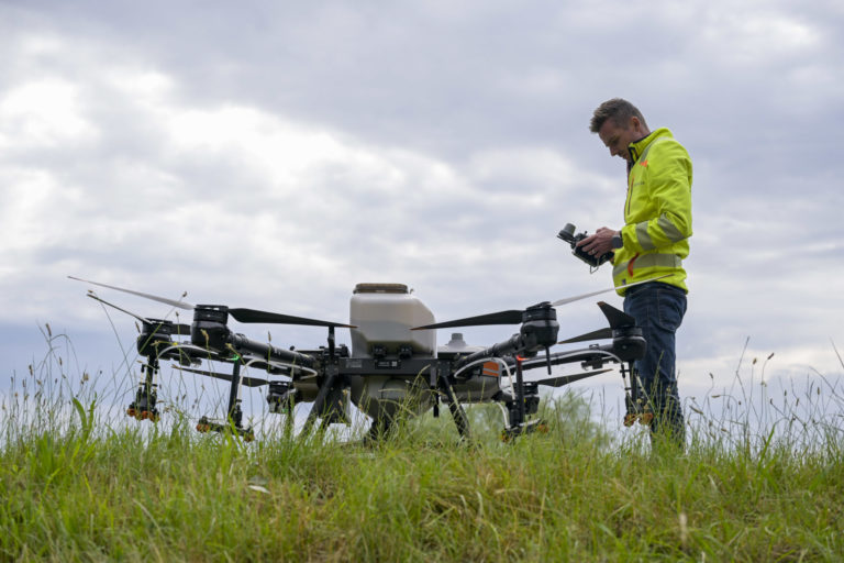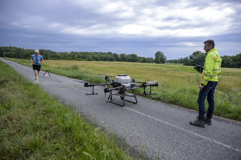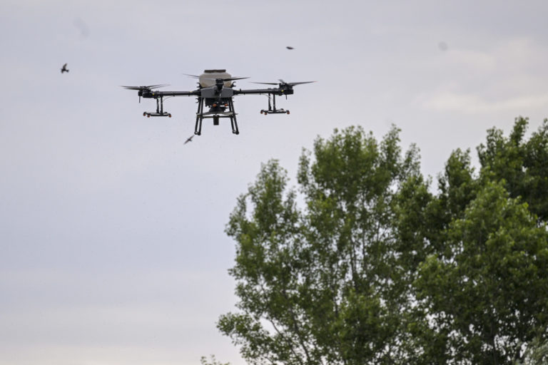 Dron s larvicídom BTI, ktorý bude rozprašovaný v blízkosti Ovsištskej lúky v Petržalke na elimináciu komárov. Bratislava, 12. jún 2024. Foto: SITA/Milan Illík.