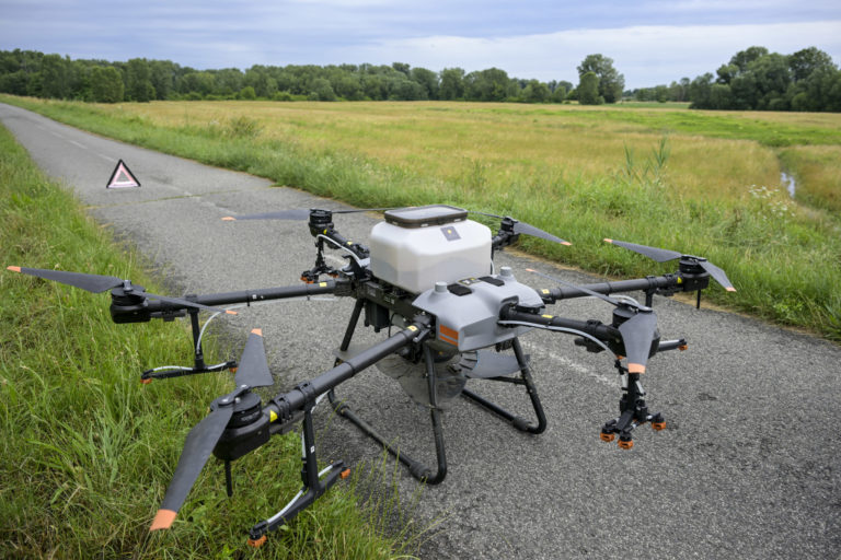 Dron s postrekom s larvicídom BTI, ktorý bude rozprašovaný v blízkosti Ovsištskej lúky v Petržalke na elimináciu komárov. Bratislava, 12. jún 2024. Foto: SITA/Milan Illík.