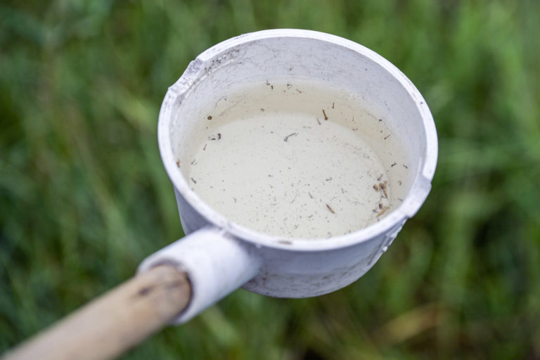 Larvy komárov vo vzorke vody z podmočenej pôdy počas zásahu na elimináciu komárov aplikáciou larvidcídu BTI prostredníctvom dronu v blízkosti Ovsištskej lúky v Petržalke. Bratislava, 12. jún 2024. Foto: SITA/Milan Illík.