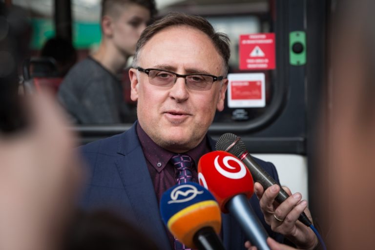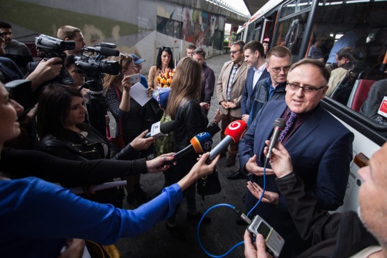 Predseda predstavenstva a generálny riaditeľ DPB Milan Urban (vpravo) počas brífingu, ktorý sa konal pred rozlúčkovou jazdou autobusom Ikarus 435. Bratislava, 20. máj 2016. Foto: SITA/Marko Erd