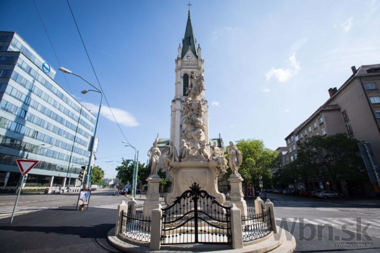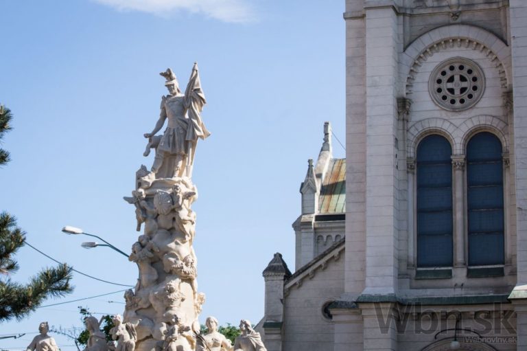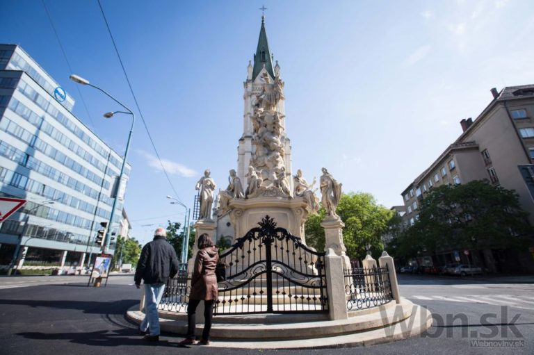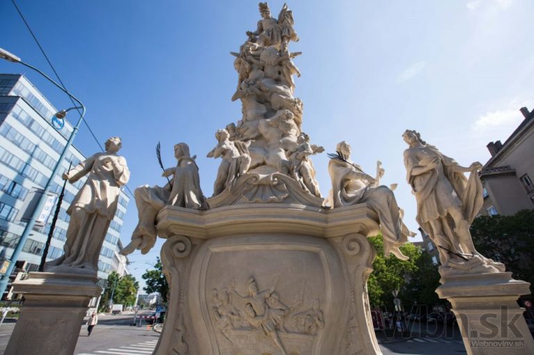 Pohľad na zreštaurované súsošie sv. Floriána. Súsošie bolo v reštaurátorskej dielni od roku 2007. Osemapolmetrový stĺp postavili v roku 1732 na pamäť veľkého bratislavského požiaru. Bratislava, 4. máj 2014. Foto: SITA/Jozef Jakubčo