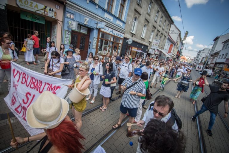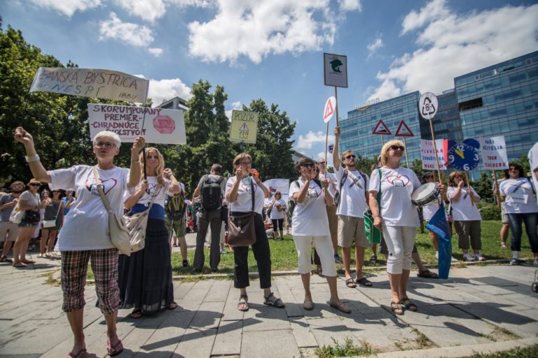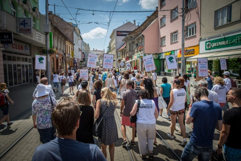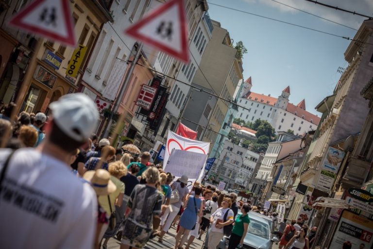 Účastníci protestného zhromaždenia Iniciatívy slovenských učiteľov a Iniciatívy vysokoškolských učiteľov na Obchodnej ulici. Bratislava, 1. júl 2016. Foto: SITA/Marko Erd