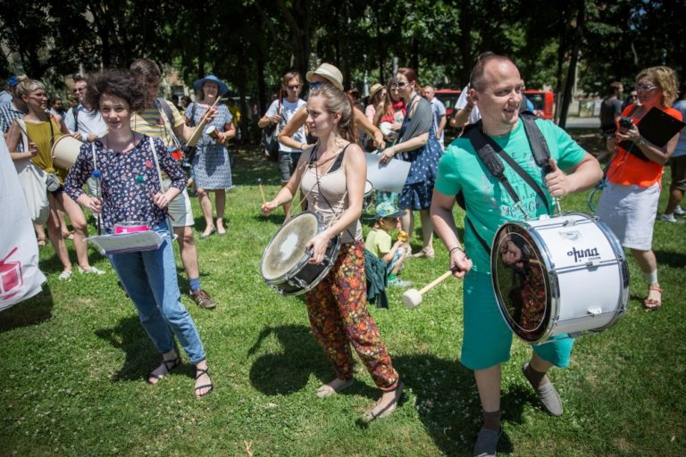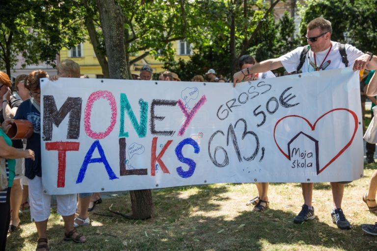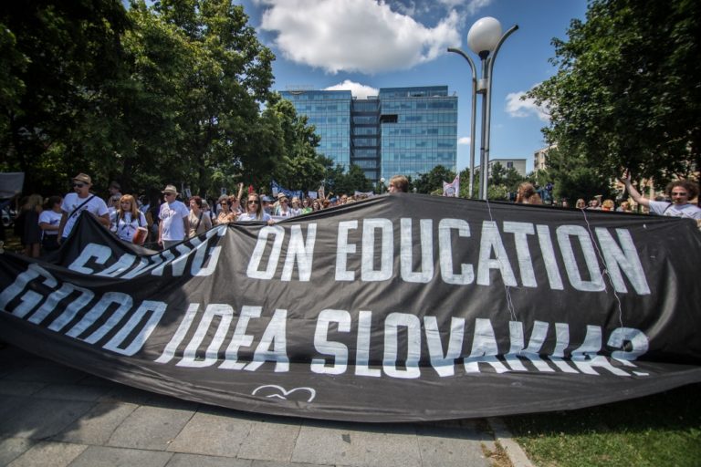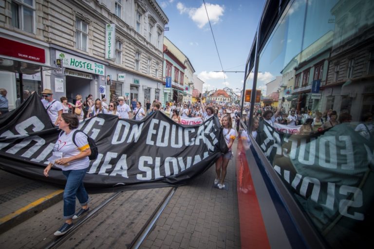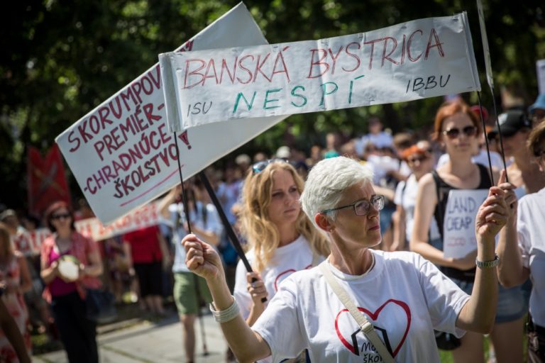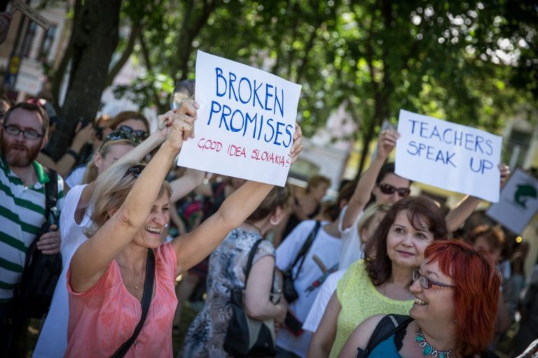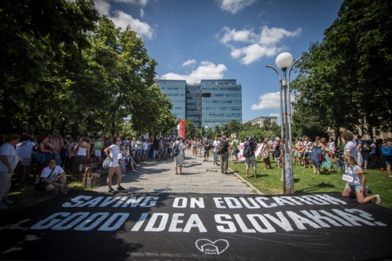 Účastníci protestného zhromaždenia Iniciatívy slovenských učiteľov a Iniciatívy vysokoškolských učiteľov na Kollárovom námestí. Bratislava, 1. júl 2016. Foto: SITA/Marko Erd