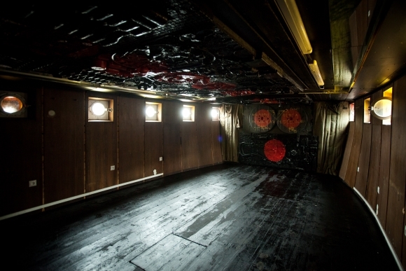 Spustenie zrekonštruovanej najstaršej lode na Slovensku - slovakeana.sk s mobilnou galériou maliara Adolfa Bencu v prístave osobnej lodnej dopravy. Bratislava, 12. apríl 2012. Foto: SITA/Diana Černáková