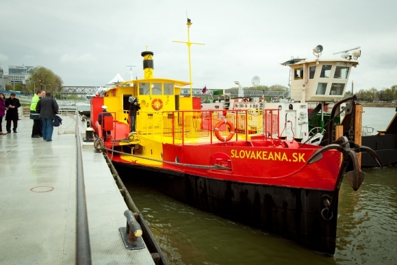 Spustenie zrekonštruovanej najstaršej lode na Slovensku - slovakeana.sk s mobilnou galériou maliara Adolfa Bencu v prístave osobnej dopravy. Bratislava, 12. apríl 2012. Foto: SITA/Diana Černáková