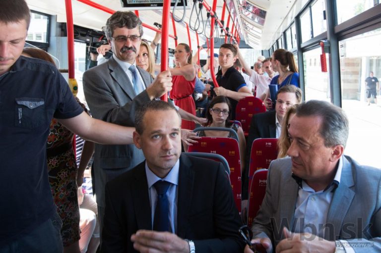 Generálny riaditeľ Dopravného podniku Bratislava Ľubomír Belfi (vpravo) a primátor Bratislavy Milan Ftáčnik (druhý zľava) počas novinárskej jazdy novým trolejbusom Škoda 30 Tr. Bratislava, 9. jún 2014. Foto: SITA/Jozef Jakubčo