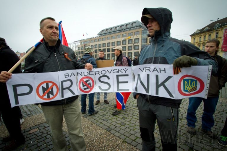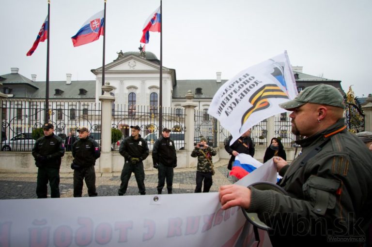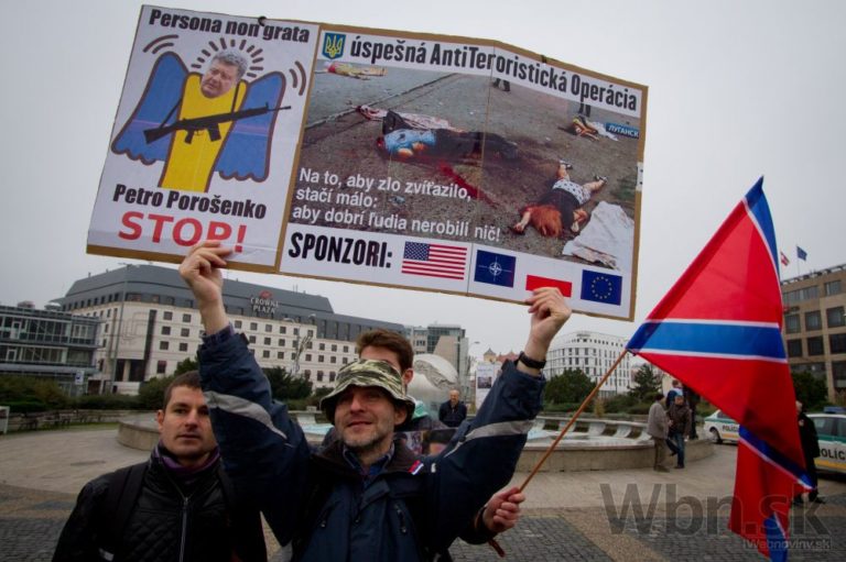 Účastníci protestu proti ukrajinskému prezidentovi Petrovi Porošenkovi počas jeho stretnutia s prezidentom SR v Prezidentskom paláci. Bratislava, 16. november 2014.