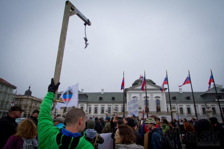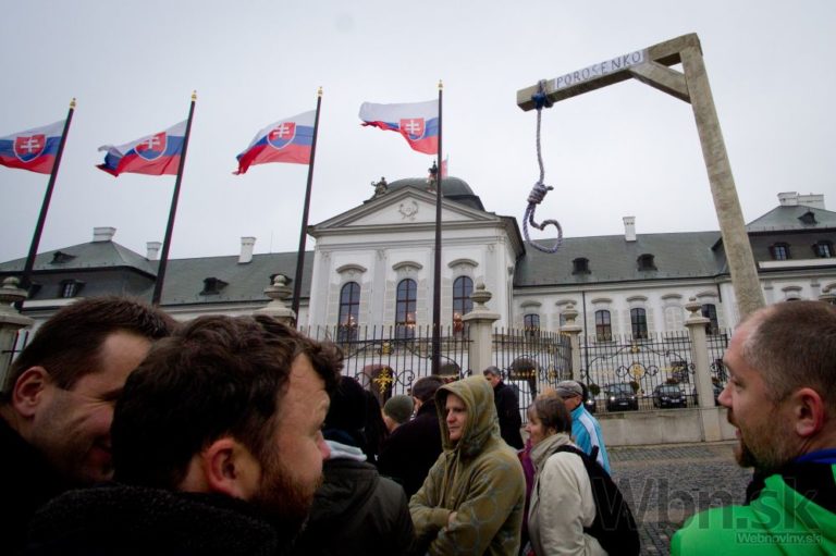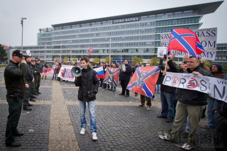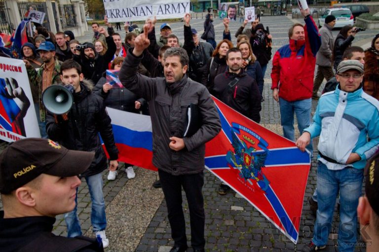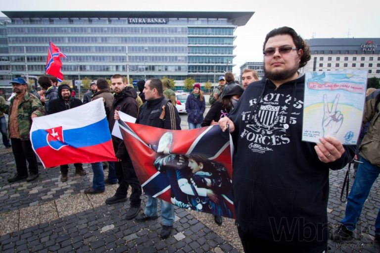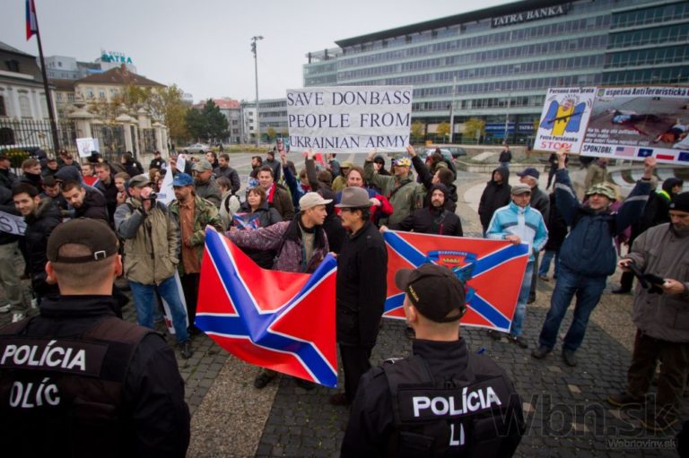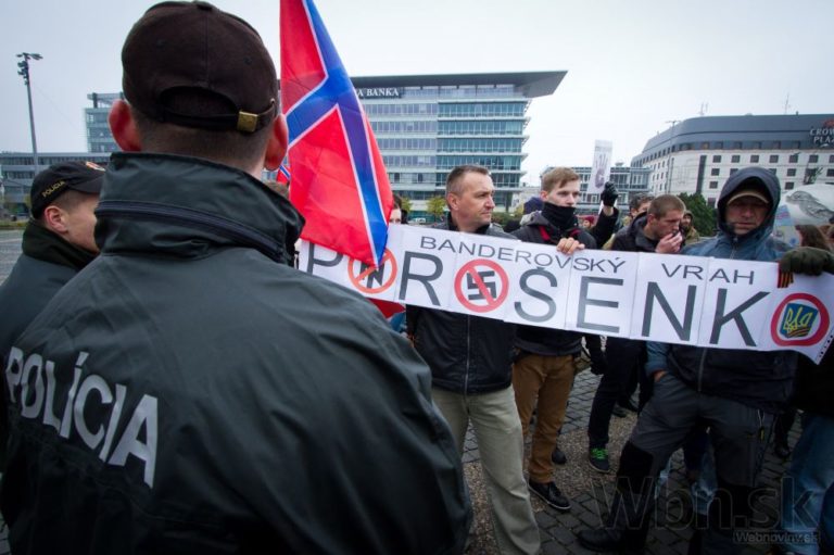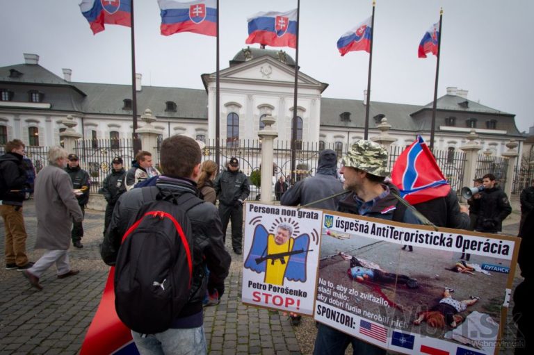 Účastníci protestu proti ukrajinskému prezidentovi Petrovi Porošenkovi počas jeho stretnutia s prezidentom SR v Prezidentskom paláci. Bratislava, 16. november 2014. Foto: SITA/Ľudovít Vaniher