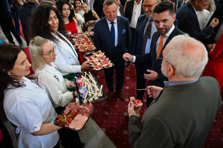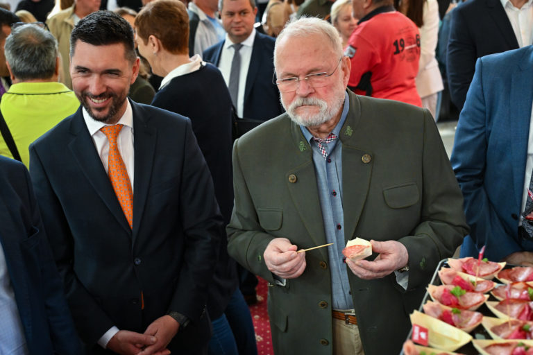 Minister pôdohospodárstva a rozvoja vidieka SR Richard Takáč (v popredí druhý sprava) a predseda Slovenskej národnej strany Andrej Danko (v popredí druhý zľava) počas Medzinárodného veľtrhu gastronómie Danubius Gastro v Inchebe. Bratislava, 12. apríl 2024. Foto: SITA.