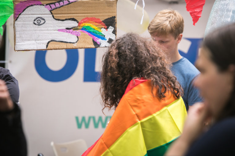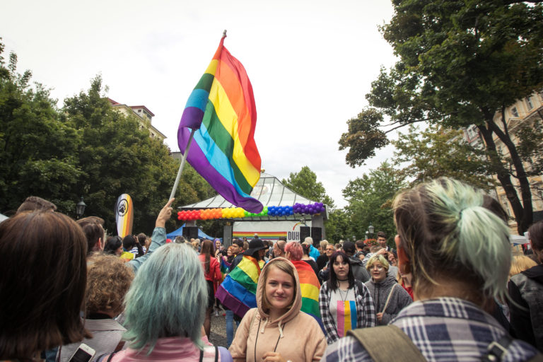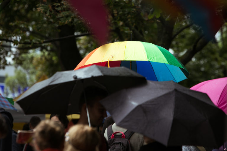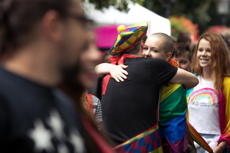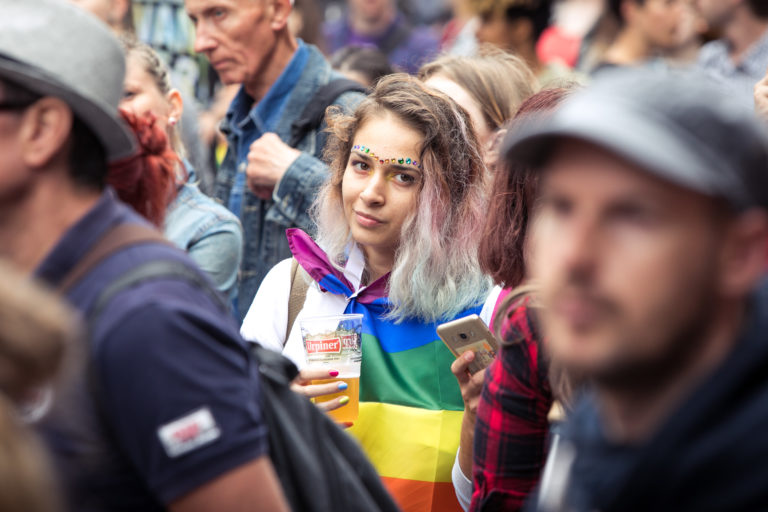 Účastníci 7. ročníka pochodu Dúhový PRIDE Bratislava 2017 v centre mesta. Podujatie organizujú LGBTI združenia Queer Leaders Forum a Iniciatíva Inakosť. Bratislava, 19. august 2017. Foto: SITA/Diana Černáková