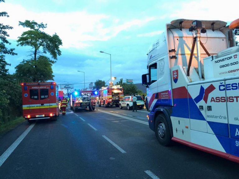 Tragická dopravná nehoda na Ulici Svornosti v Bratislave, kde sa v stredu nadránom zrazilo nákladné a osobné auto. Nehoda si vyžiadala jednu obeť a dvoch zranených. V osobnom aute prišiel o život 46-ročný muž, 46-ročná žena mala otvorenú ranu hlavy a 18-ročný mladík mal úraz hlavy a poranenie v oblasti panvy. Na mieste zasahovalo 19 hasičov s piatimi kusmi hasičskej techniky. Bratislava, 13. júl 2016. Foto: SITA/odtahovka.sk