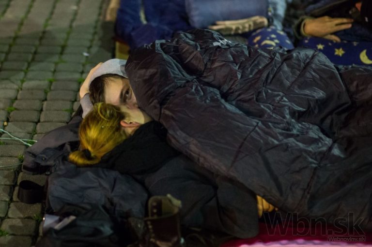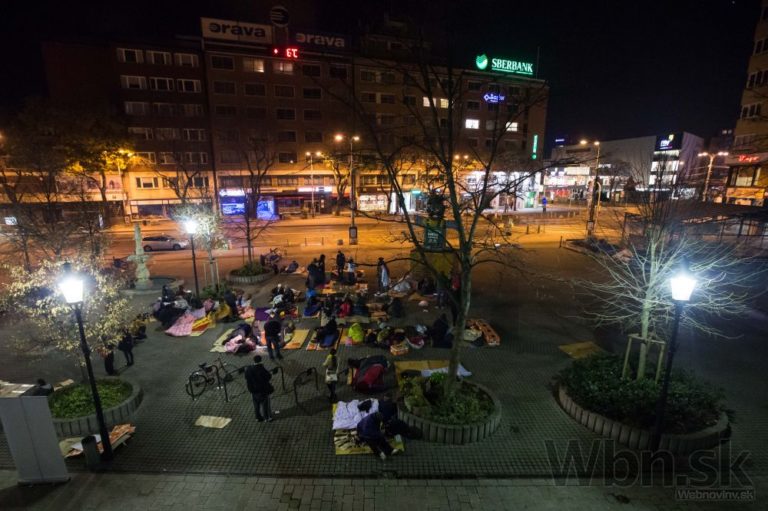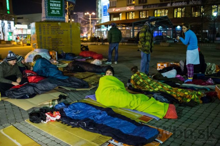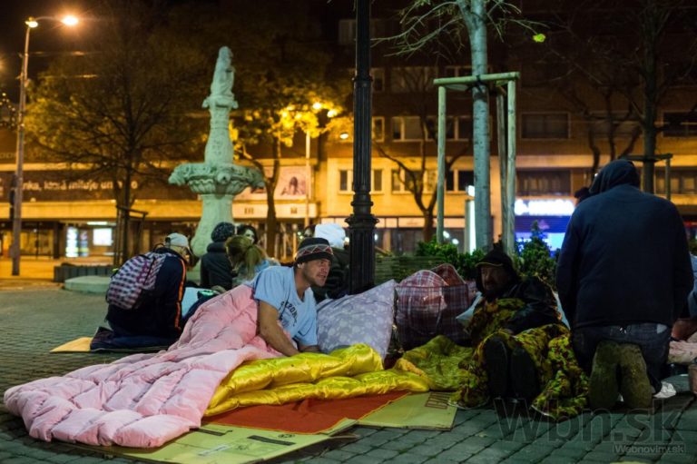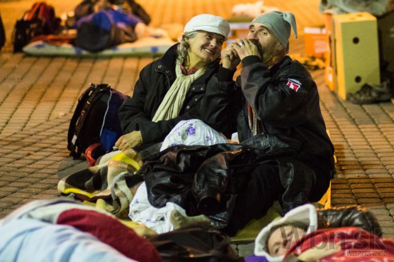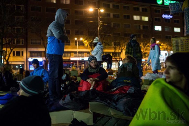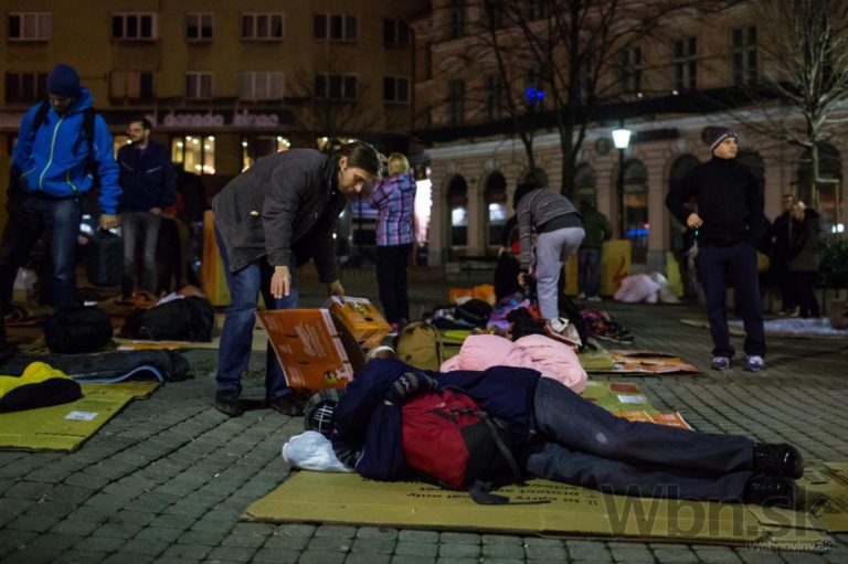 Pohľad na účastníkov charitatívnej akcie Noc Vonku, ktorej cieľom je verejne vyjadriť podporu ľuďom bez domova. Akcia je súčasťou Mesiaca bez domova, ktorý sa koná v Bratislave do 13. decembra. Bratislava, 21. november 2014.