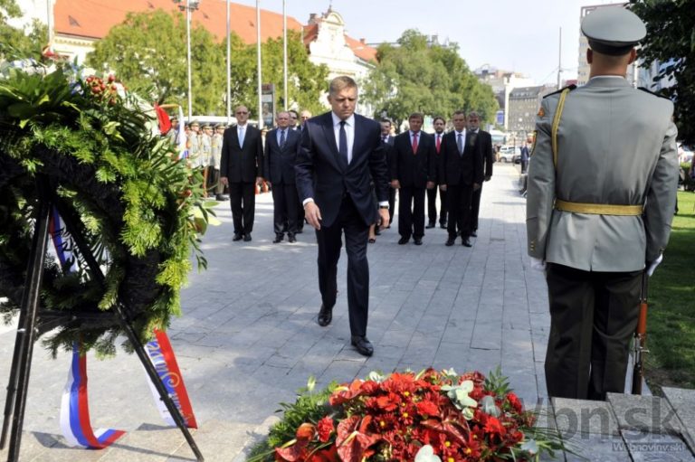 Premiér Robert Fico (v strede) počas spomienkového a pietneho aktu kladenia vencov pri príležitosti 71. výročia Slovenského národného povstania. Bratislava, 27. august 2015. Foto: SITA/Ján Slovák