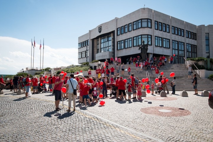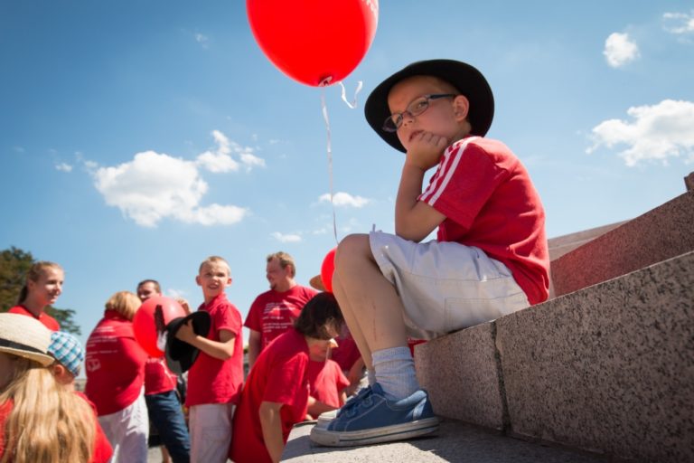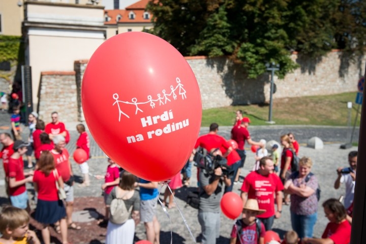 Balón s logom 5. ročníka živej reťaze s názvom Hrdí na rodinu pred Národnou radou SR. Podujatie je reakciou na Dúhový PRIDE. Bratislava, 30. júl 2016. Foto: SITA/Marek Mrviš