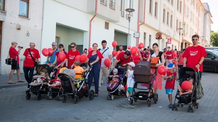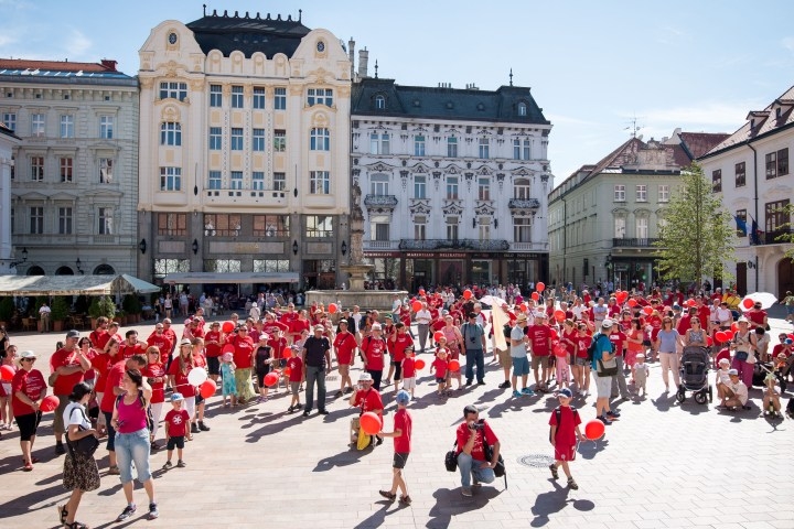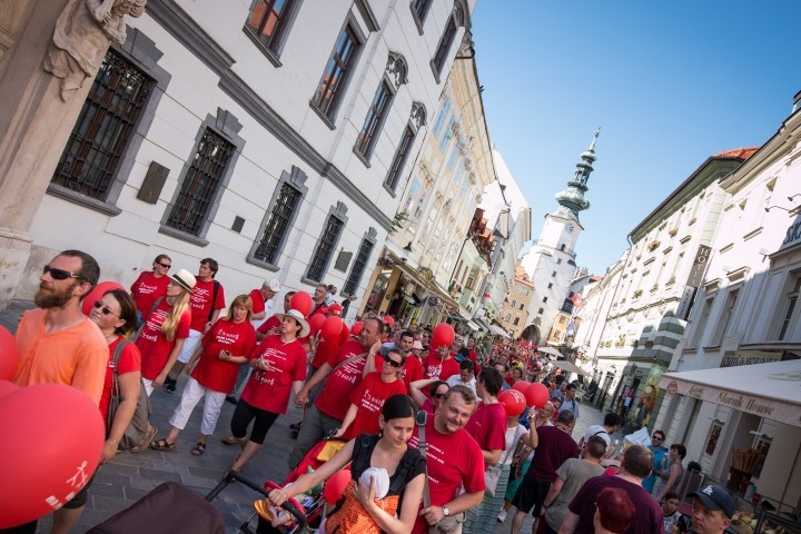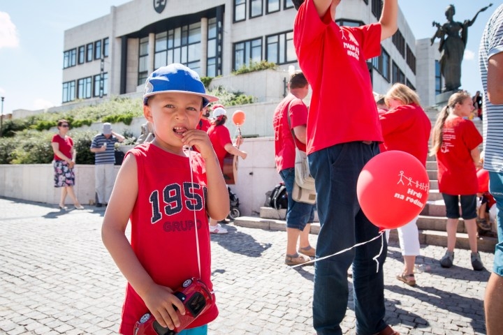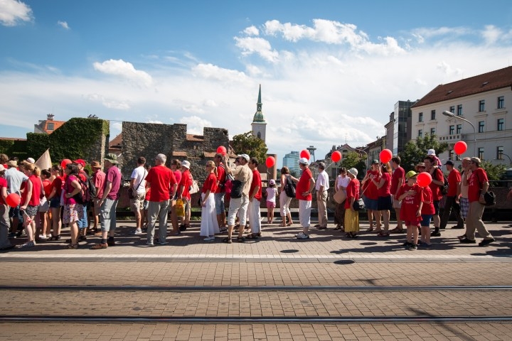 Účastníci akcie 5. ročníka živej reťaze s názvom Hrdí na rodinu na Hlavnom námestí. Podujatie je reakciou na Dúhový PRIDE. Bratislava, 30. júl 2016. Foto: SITA/Marek Mrviš