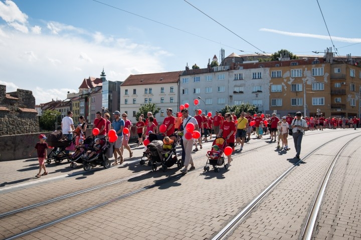 Účastníci 5. ročníka živej reťaze s názvom Hrdí na rodinu pred Národnou radou SR. Podujatie je reakciou na Dúhový PRIDE. Bratislava, 30. júl 2016. Foto: SITA/Marek Mrviš
