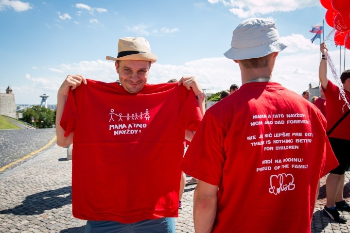 Účastníci akcie s tričkami 5. ročníka živej reťaze s názvom Hrdí na rodinu pred Národnou radou SR. Podujatie je reakciou na Dúhový PRIDE. Bratislava, 30. júl 2016. Foto: SITA/Marek Mrviš