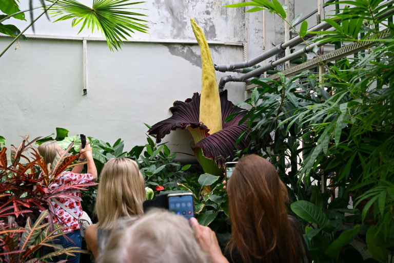 Návštevníci fotografujú Amorfofalus obrovský (bot. Amorphophallus titanum), ktorý na Slovensku po prvýkrát rozkvitol v skleníku Botanickej záhrady v Bratislave. Bratislava, 7. august 2024. Foto: SITA