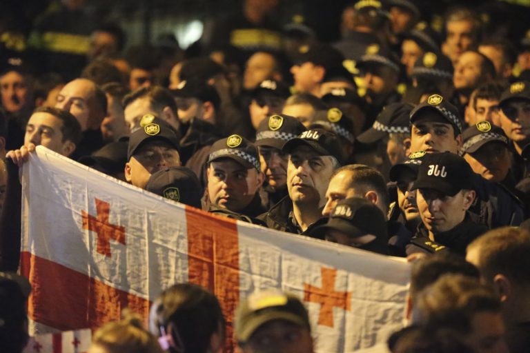 Demonštrácie pred gruzínskym parlamentom na protest proti plánom vlády obmedziť mimovládneh organizácie financované zo zahraničia. (AP Photo/Zurab Tsertsvadze)