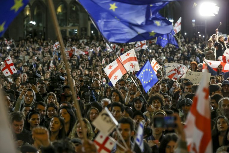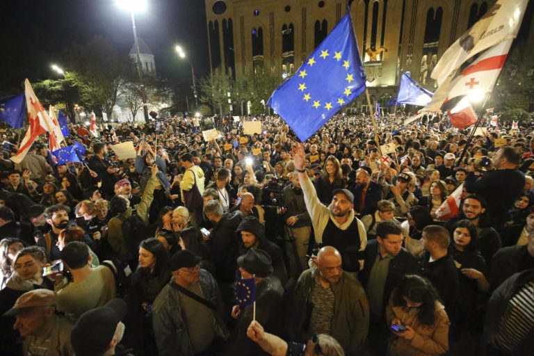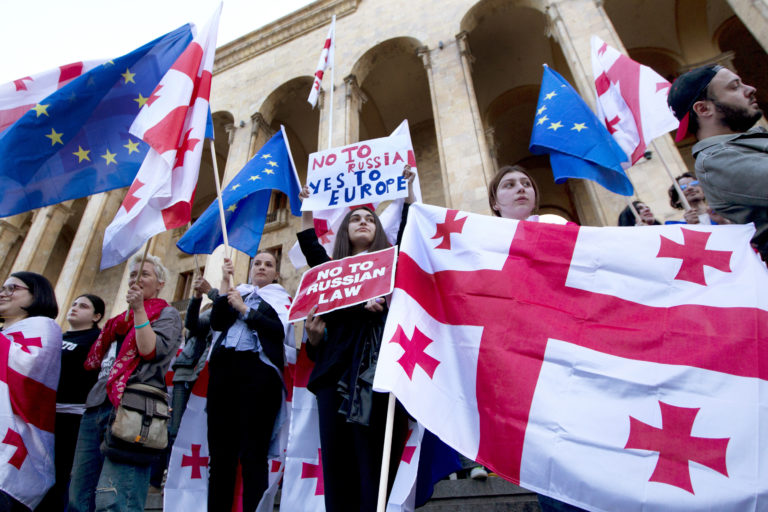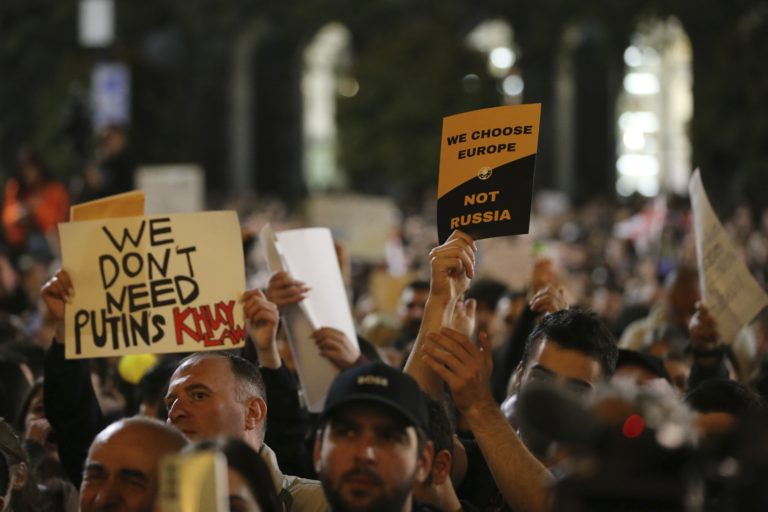 Podľa návrhu by museli všetky mimovládne organizácie, ktoré získavajú viac ako 20 percent svojich financií zo zahraničia, podávať každoročne vyhlásenie. Podobná legislatíva platí v Rusku, pričom tam sa používa najmä na umlčiavanie disentu. Na snímke demonštrácie v Gruzínsku proti návrhu zákona o zahraničných agentoch. (AP Photo/Zurab Tsertsvadze)
