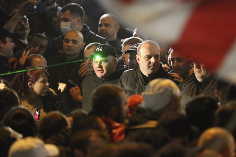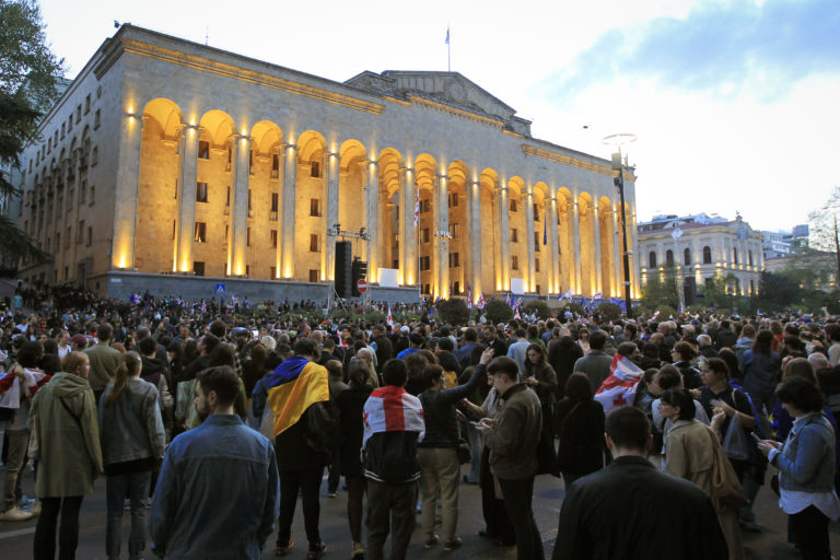 Niekoľko stoviek ľudí sa v pondelok zhromaždilo pred gruzínskym parlamentom na protest proti plánom vlády obmedziť mimovládneh organizácie financované zo zahraničia. (AP Photo/Shakh Aivazov)