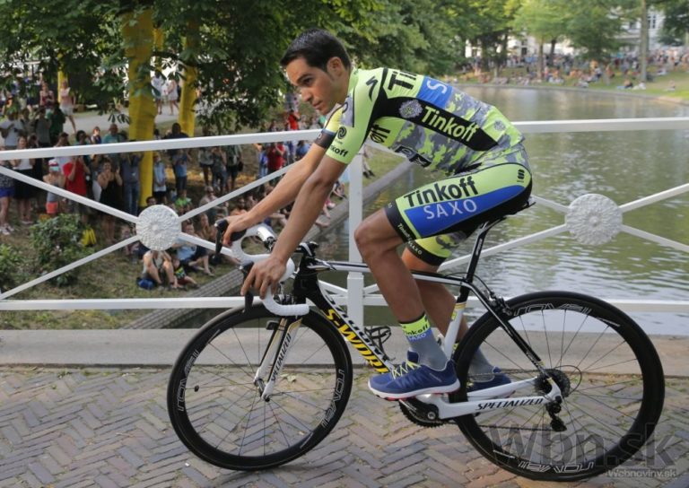 V holandskom Ultrechte sa pred tisíckami fanúšikov Tour de France predstavili jednotlivé cyklistické tímy. Na fotografii Španiel Alberto Contador z tímu Team Tinkoff-Saxo prichádza na tímovú prezentáciu. Holandsko, 2. júla 2015. Foto: SITA/AP