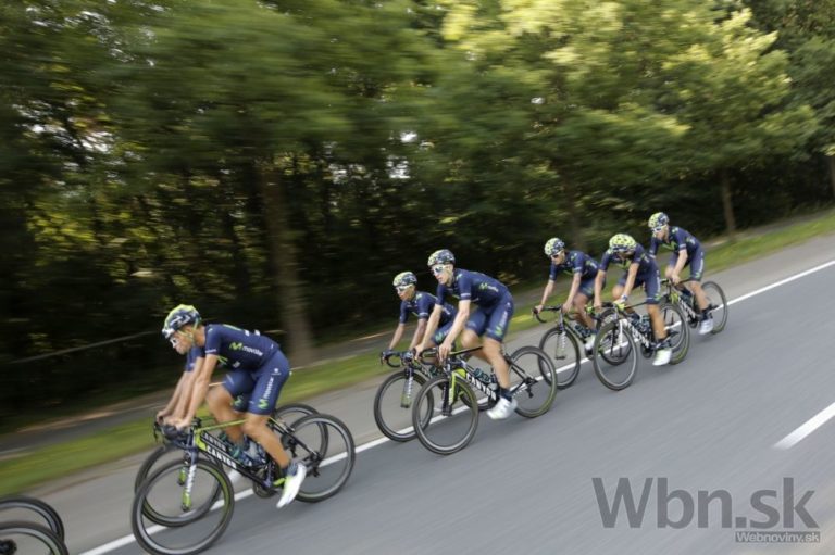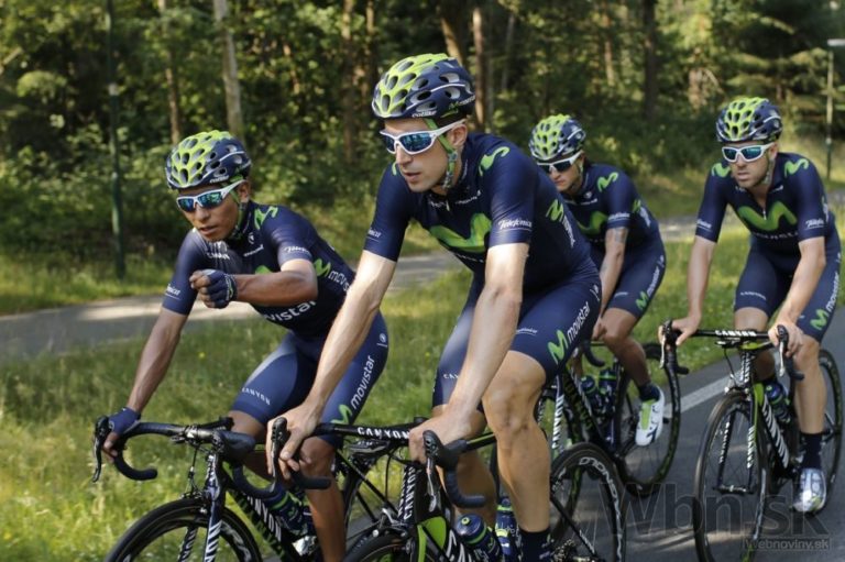 V holandskom Ultrechte sa pred tisíckami fanúšikov Tour de France predstavili jednotlivé cyklistické tímy. Na fotografii Kolumbijčan Nairo Quintana (vľavo) a jeho tím Movistar počas tréningu dva dni pred začatím Tour de France. Holandsko, 2. júla 2015. Foto: SITA/AP