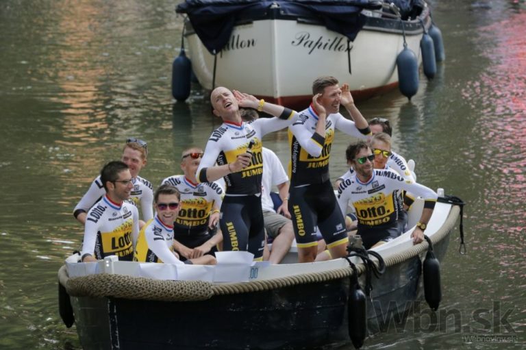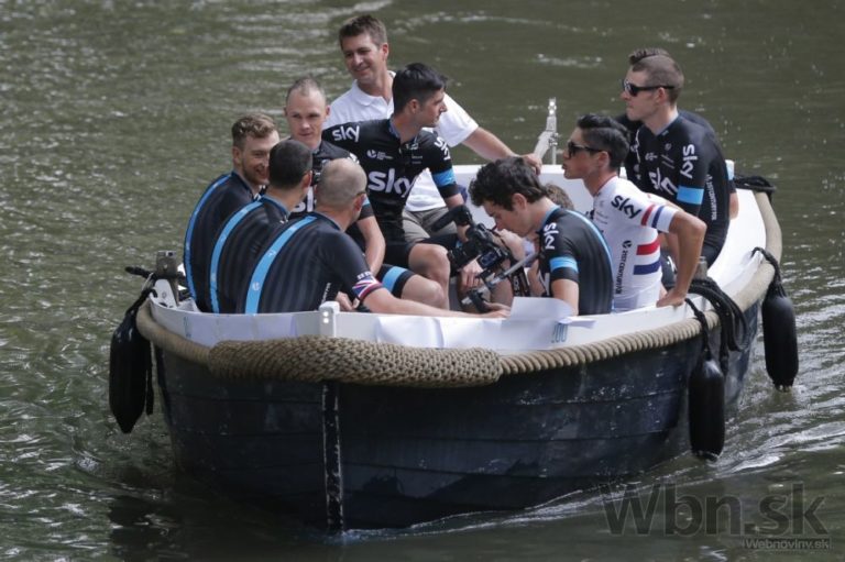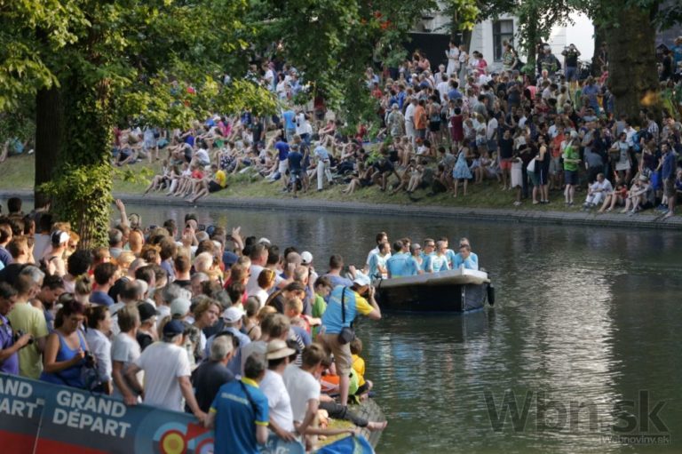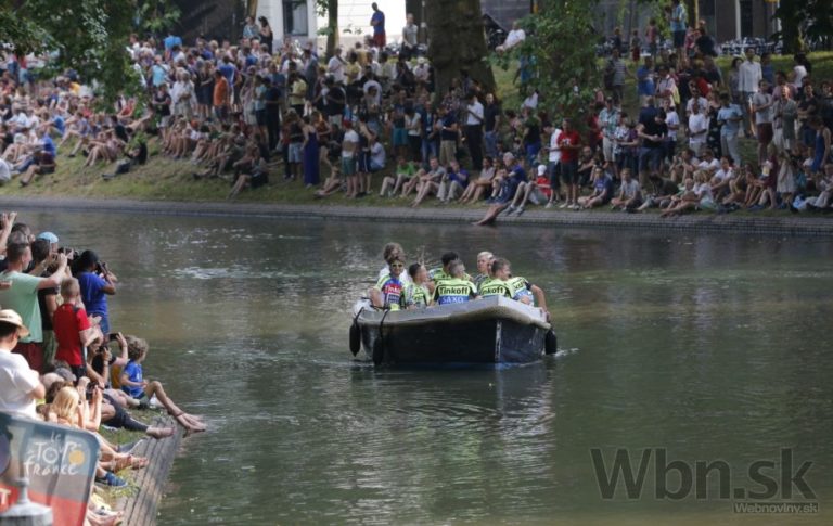 V holandskom Ultrechte sa pred tisíckami fanúšikov Tour de France predstavili jednotlivé cyklistické tímy. Na fotografii jazdci tímu Team Tinkoff-Saxo so Španielom Albertom Contadorom a Slovákom Petrom Saganom prichádzajú po rieke na lodi na tímovú prezentáciu. Holandsko, 2. júla 2015. Foto: SITA/AP