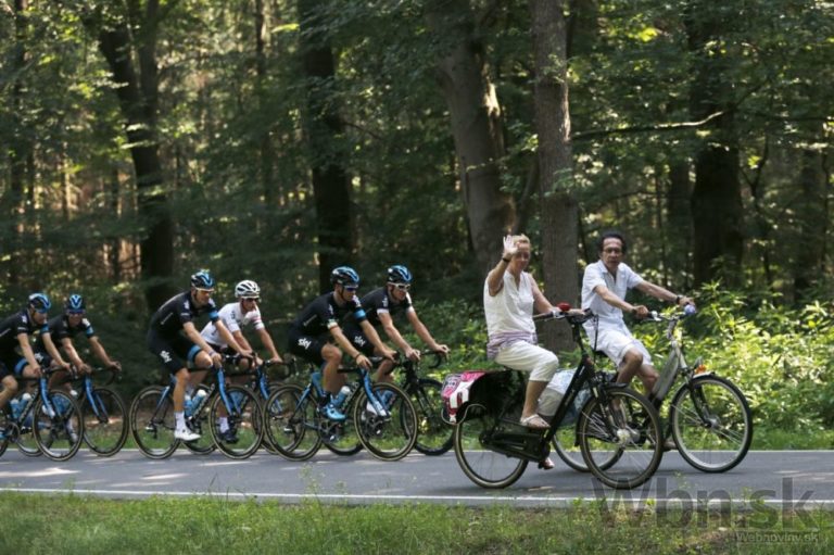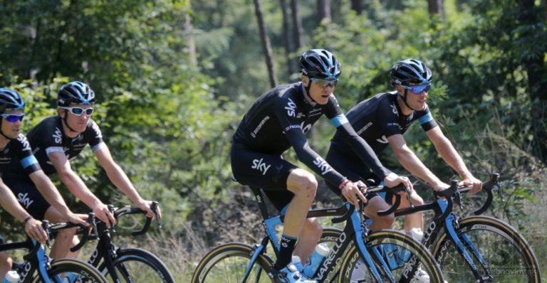 V holandskom Ultrechte sa pred tisíckami fanúšikov Tour de France predstavili jednotlivé cyklistické tímy. Na fotografii Brit Christopher Froome (druhý sprava) a Austrálčan Richie Porte trénujú so spolujazdcami z tímu dva dni pred začatím Tour de France. Holandsko, 2. júla 2015. Foto: SITA/AP