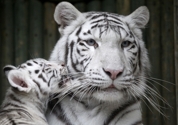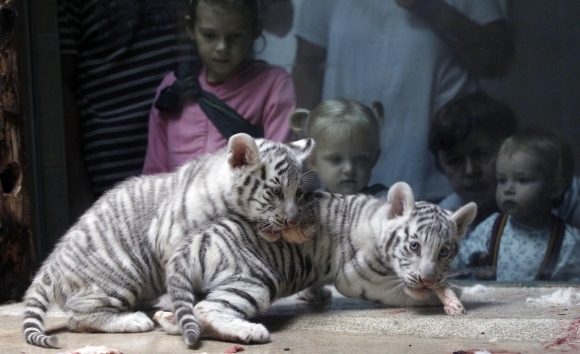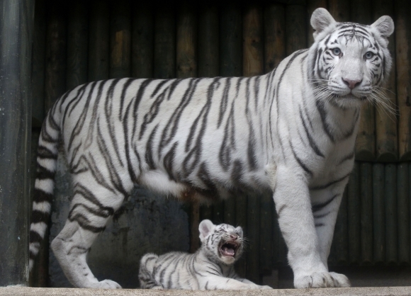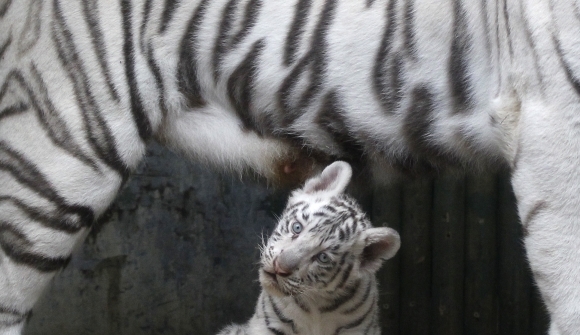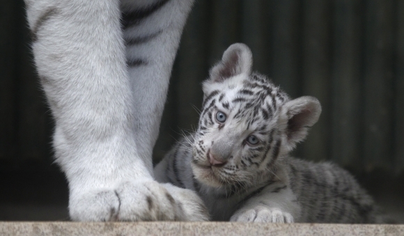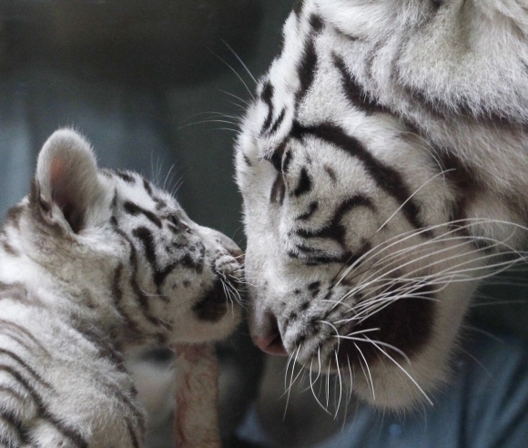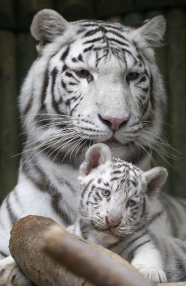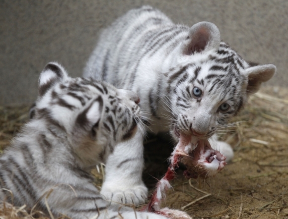 Tri mláďatá vzácnych bielych tigrov sa narodili v libereckej zoo. Ošetrovatelia ich predstavili na stretnutí s novinármi, avšak pavilón šeliem pred návštevníkmi dočasne uzatvorili. Štvorročná samica Surya Bára porodila v nedeľu ráno. Podľa ošetrovateľov ich najskôr olízala, dala im napiť sa mlieka a potom ich pozorne strážila. Foto: SITA/AP
