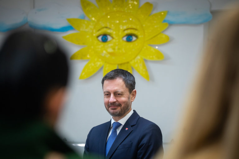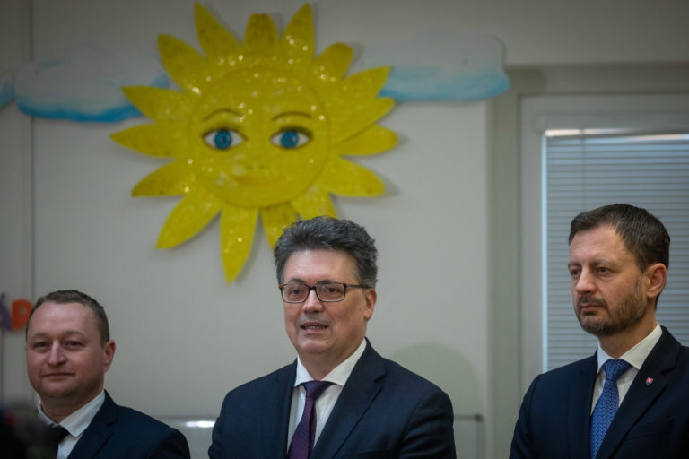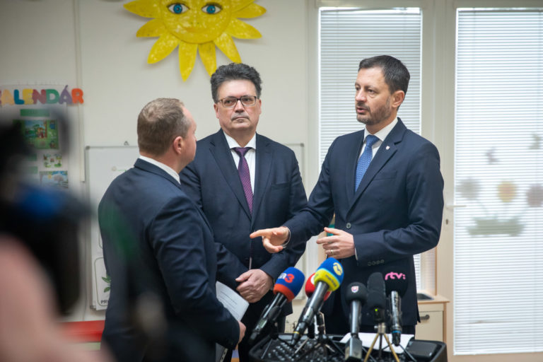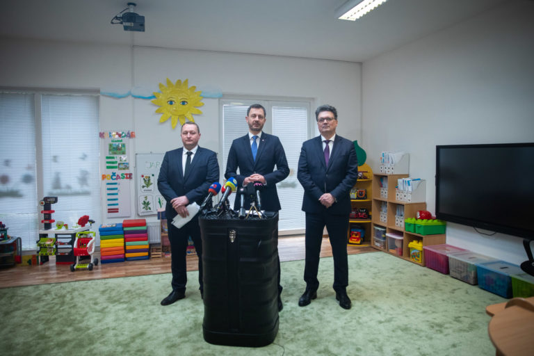 Dočasne poverený predseda vlády SR Eduard Heger (vpravo) počas predstavenia prvej rozšírenej materskej školy v obci Láb, ktorú podporili z Plánu obnovy a odolnosti SR. Bratislava, 28. marec 2023. Foto: SITA/ÚV SR/Ľuboš Bilačič