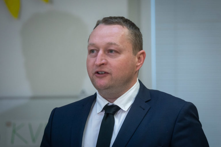 Starosta obce Láb Štefan Fogl počas tlačového brífingu dočasne povereného ministra školstva, dočasne povereného predsedu vlády SR a starostu obce Láb pri príležitosti predstavenia prvej materskej školy v obci Láb, ktorú podporili z Plánu obnovy a odolnosti SR. Láb, 28. marec 2023. Foto: SITA/Diana Černáková