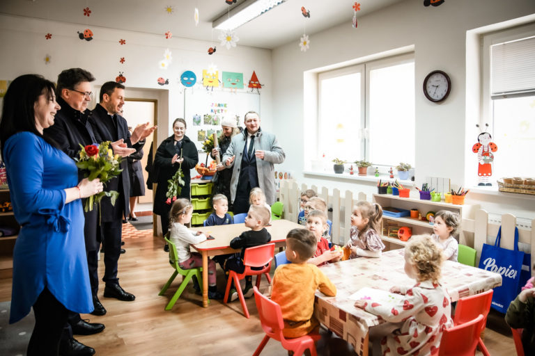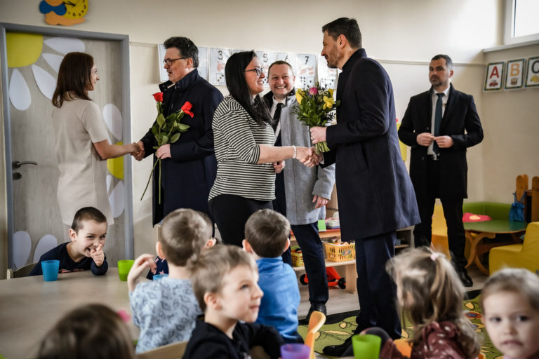 Dočasne poverený minister školstva, vedy, výskumu a športu Ján Horecký (druhý zľava) a dočasne poverený predseda vlády SR Eduard Heger (druhý sprava) gratulujú učiteľkám ma terskej školy ku Dňu učiteľov počas predstavenia prvej rozšírenej materskej školy v obci Láb, ktorú podporili z Plánu obnovy a odolnosti SR. Bratislava, 28. marec 2023. Foto: SITA/ÚV SR/Ľuboš Bilačič