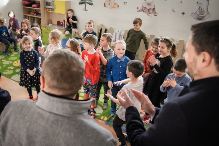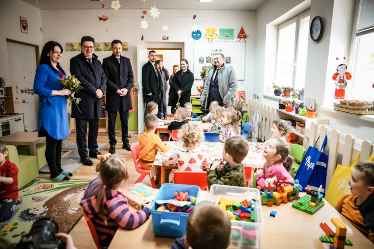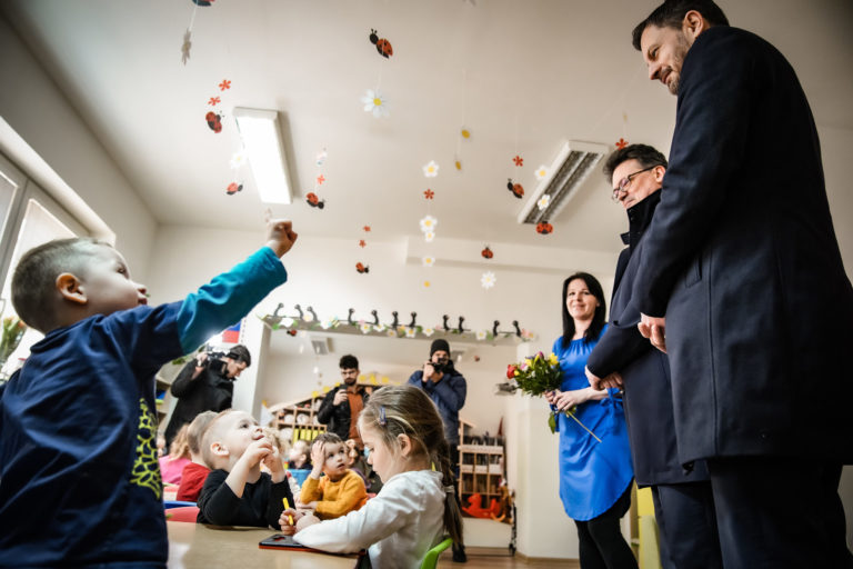Dočasne poverený minister školstva, vedy, výskumu a športu Ján Horecký (druhý zľava v pozadí) a dočasne poverený predseda vlády SR Eduard Heger (vpravo hore) počas predstavenia prvej rozšírenej materskej školy v obci Láb, ktorú podporili z Plánu obnovy a odolnosti SR. Bratislava, 28. marec 2023. Foto: SITA/ÚV SR/Ľuboš Bilačič