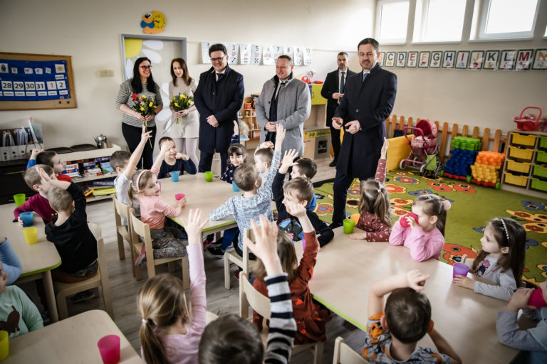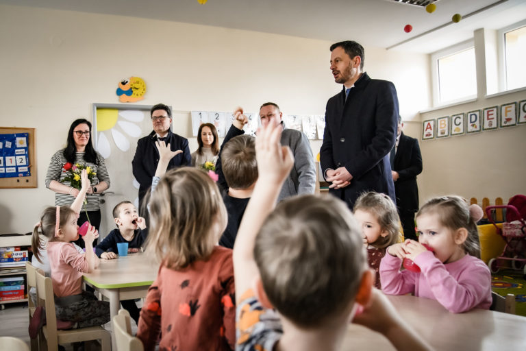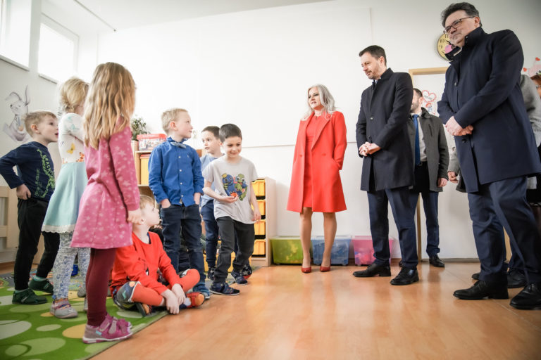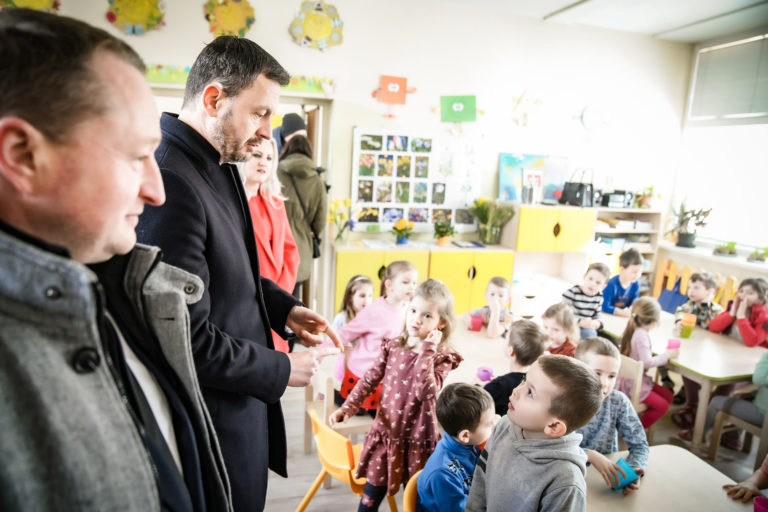 Dočasne poverený predseda vlády SR Eduard Heger (druhý zľava) počas predstavenia prvej rozšírenej materskej školy v obci Láb, ktorú podporili z Plánu obnovy a odolnosti SR. Bratislava, 28. marec 2023. Foto: SITA/ÚV SR/Ľuboš Bilačič