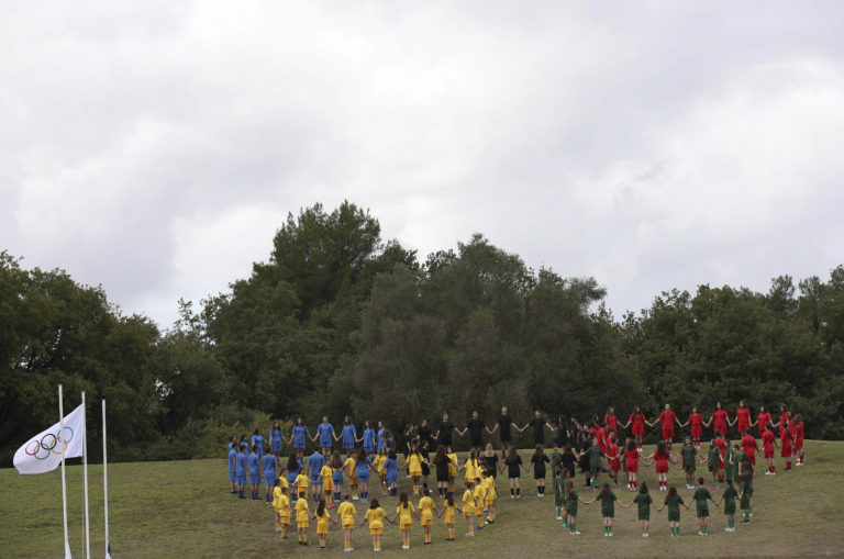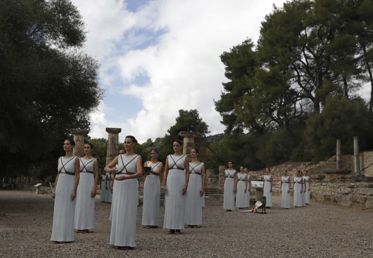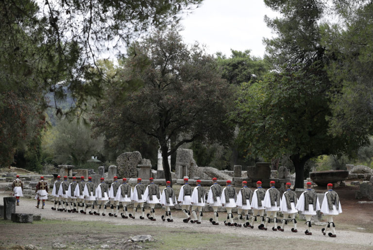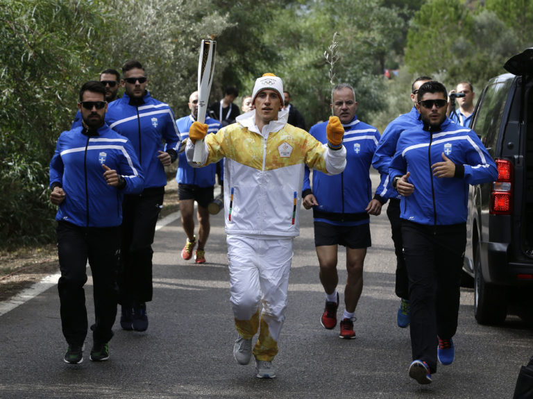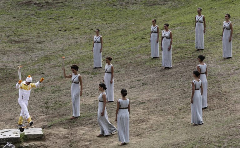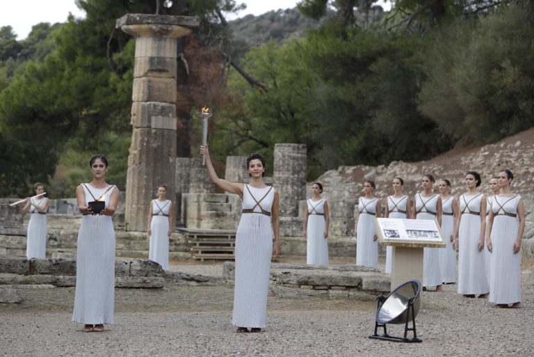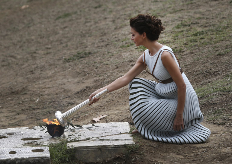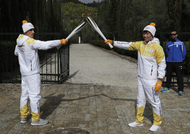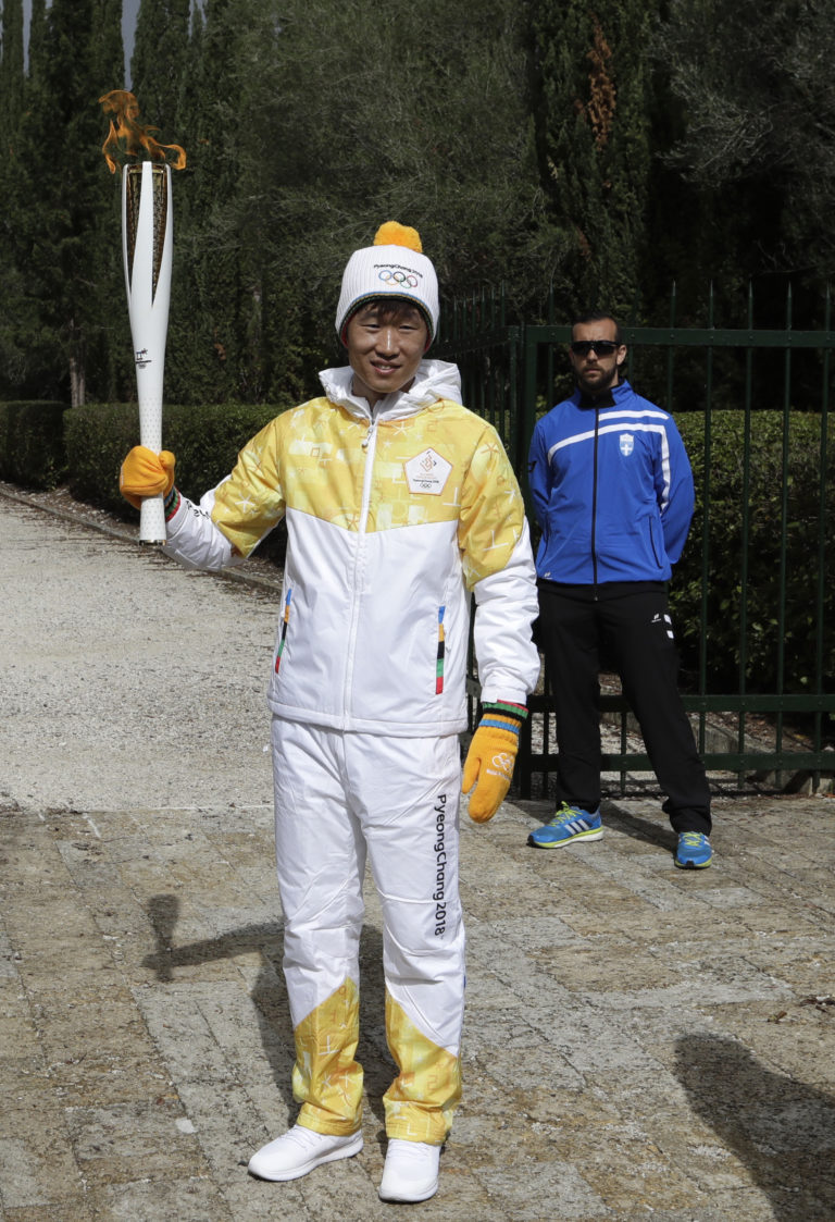 Utorkový slávnostný ceremoniál prebehol podľa zaužívaného obradu. Oheň pred troskami 2600 rokov starého Chrámu bohyne Héry do rúcha apolónovej kňažky odetá herečka Katerina Lehouová zapálila o 11.33 h SELČ. Výnimočne tak urobila už z prichystaného plameňa a nie za použitia slnečných lúčov a parabolického zrkadla, keďže v Olympii na to nebolo vhodné počasie. Neskôr o 11.50 h SELČ v lokalite niekdajšieho antického štadióna zapálila pochodeň a odovzdala ju prvému členovi štafety. Pred odletom do Kórejskej republiky pochodeň absolvuje krátku púť po Grécku. Prvým členom štafety s pochodňou bol grécky bežec na lyžiach Apostolos Angelis, ktorý sa už kvalifikoval na ZOH 2018. Olympia, 24. október 2017. Foto: SITA/AP.