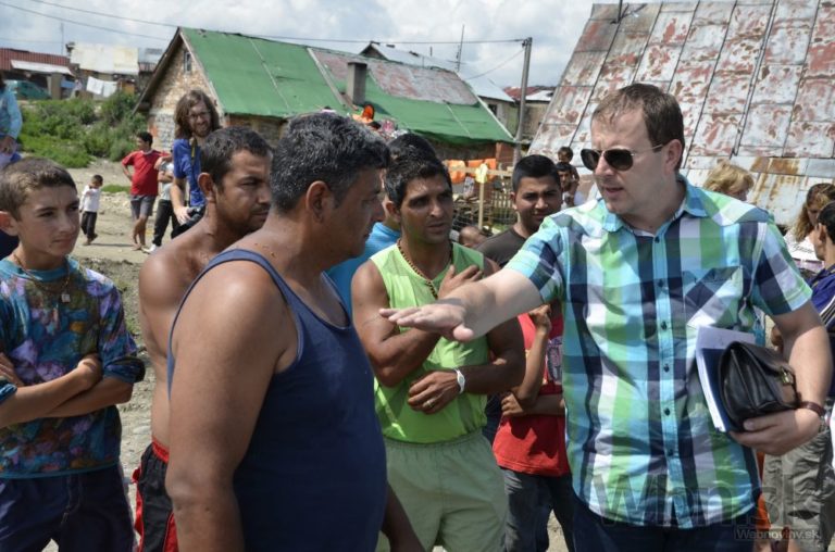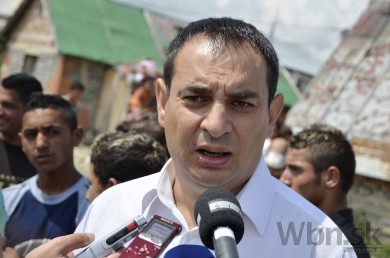 Splnomocnenec vlády SR pre rómske komunity Peter Pollák počas tlačovej besedy k začiatku svojpomocnej výstavby 3 domov v rómskej osade Nový Dvor vo Veľkej Lomnici. Veľká Lomnica, 28. júl 2014. Foto: SITA/Radoslav Maťaš