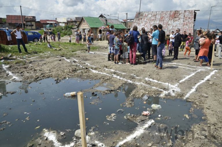 Miesto výstavby počas tlačovej besedy k začiatku svojpomocnej výstavby 3 domov v rómskej osade Nový Dvor vo Veľkej Lomnici. Veľká Lomnica, 28. júl 2014 Foto: SITA/Radoslav Maťaš
