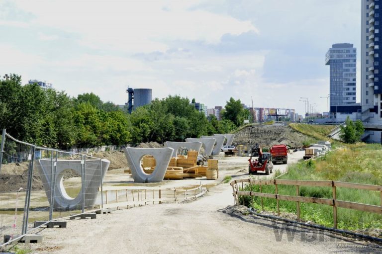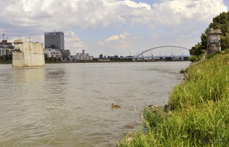 Pohľad na postup rekonštrukčných prác na Starom moste a výstavbu električkovej trate do Petržalky. Bratislava, 23. júl 2014.