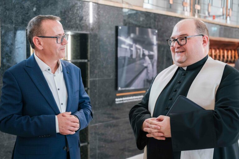 Manažér Pivovaru Šariš Petr Kwaczek a farár Jozef Pekár počas požehnania novej varne za 4,6 milióna eur. Foto: SITA/Pivovar Šariš.