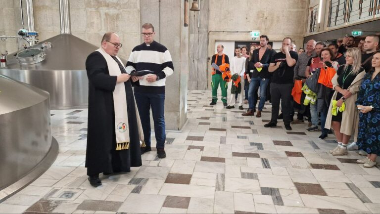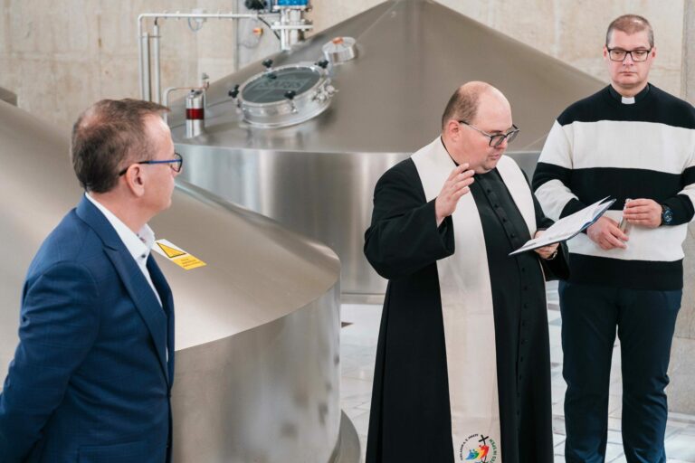 Farár Jozef Pekár počas požehnania novej varne za 4,6 milióna eur v Pivovare Šariš. Foto: SITA/Pivovar Šariš.