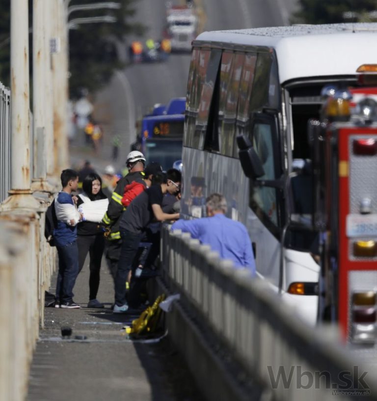 Pri nehode dvoch autobusov Seattli zahynuli štyria ľudia a ďalších 44 osôb utrpelo zranenia. K zrážke medzi turistickým obojživelným autobusom a vozidlom vezúcim zahraničných študentov došlo na rušnom Moste Georgea Washingtona nad vodným kanálom spájajúcim jazero Union s Pugetovým zálivom. Seattle, 24. september 2015. Foto: KOMONEWS.COM via AP
