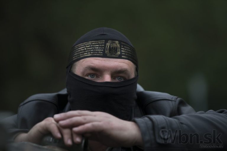 Proruskí ozbrojenci počúvajú pokyny veliteľa v Slovjansku. Ukrajina, Slovjansk, 2. mája 2014. Foto: SITA/AP