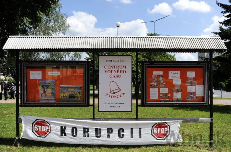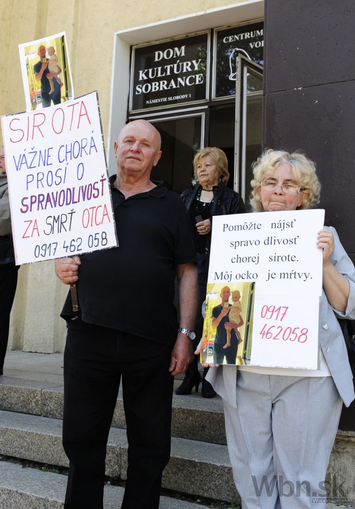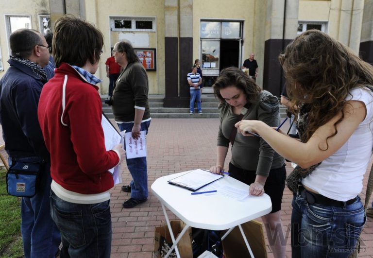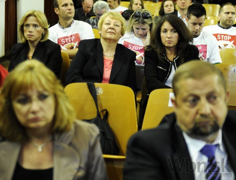 Pohľad na členov petičného výboru proti Štefanovi Harabinovi pred kultúrnym domom v Sobranciach, kde sa v pondelok zišiel najvyšší orgán súdnictva – Súdna rada SR. Jej členovia volia nového šéfa Najvyššieho súdu SR. Sobrance, 19. máj 2014. Foto: SITA/Ivan Fleischer