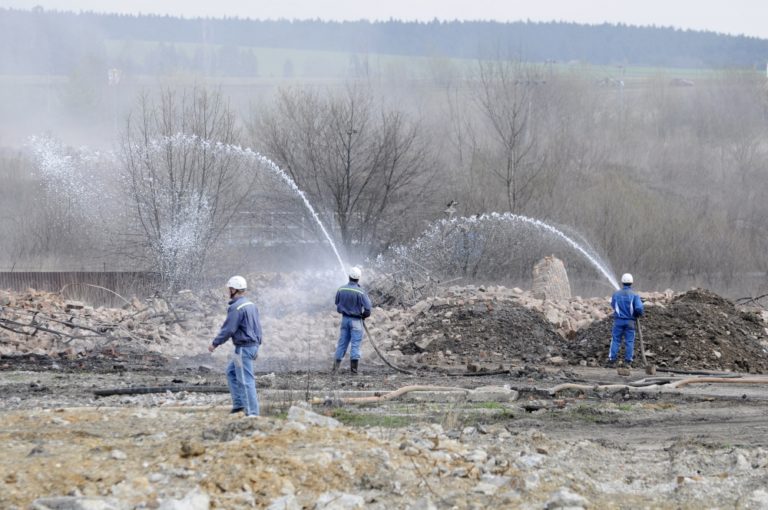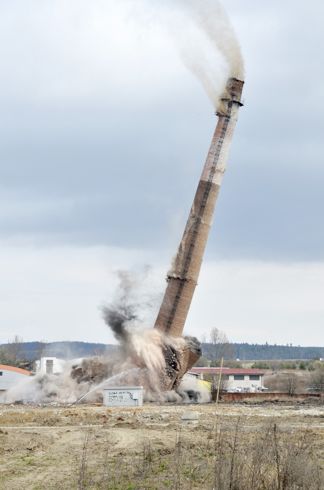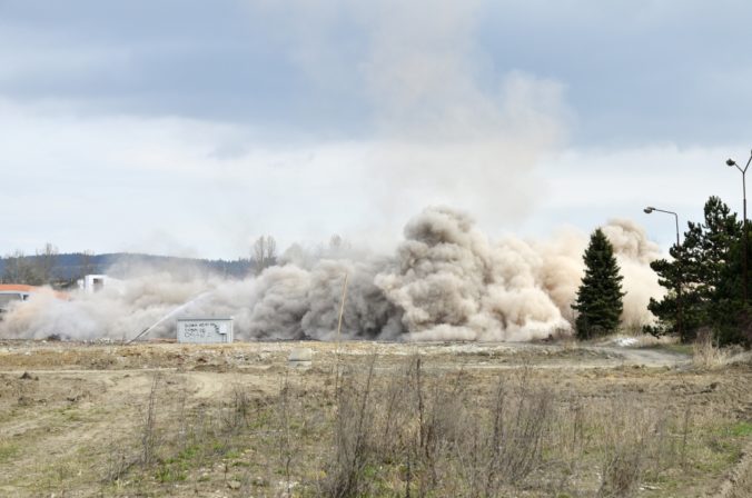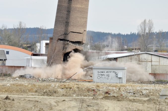 Na odstránenie komína použili 18 kilogramov trhavín a 60 rozbušiek. Foto: SITA/Radoslav Maťaš